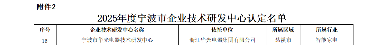 凭借在技术创新与研发体系建设方面的卓越实力,浙江华光电器集团有限公司旗下的“宁波市华光电器技术研发中心” 成功入选,被认定为2025年度宁波市企业技术研发中心。这一荣誉标志着华光电器的研发能力与创新体系获得了官方的高度认可,是企业发展历程中的重要里程碑。